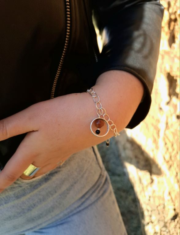 Ασημένιο χειροποίητο βραχιόλι με αλυσίδα και ημιπολύτιμους λίθους όνυχα και χρυσόλιθου .