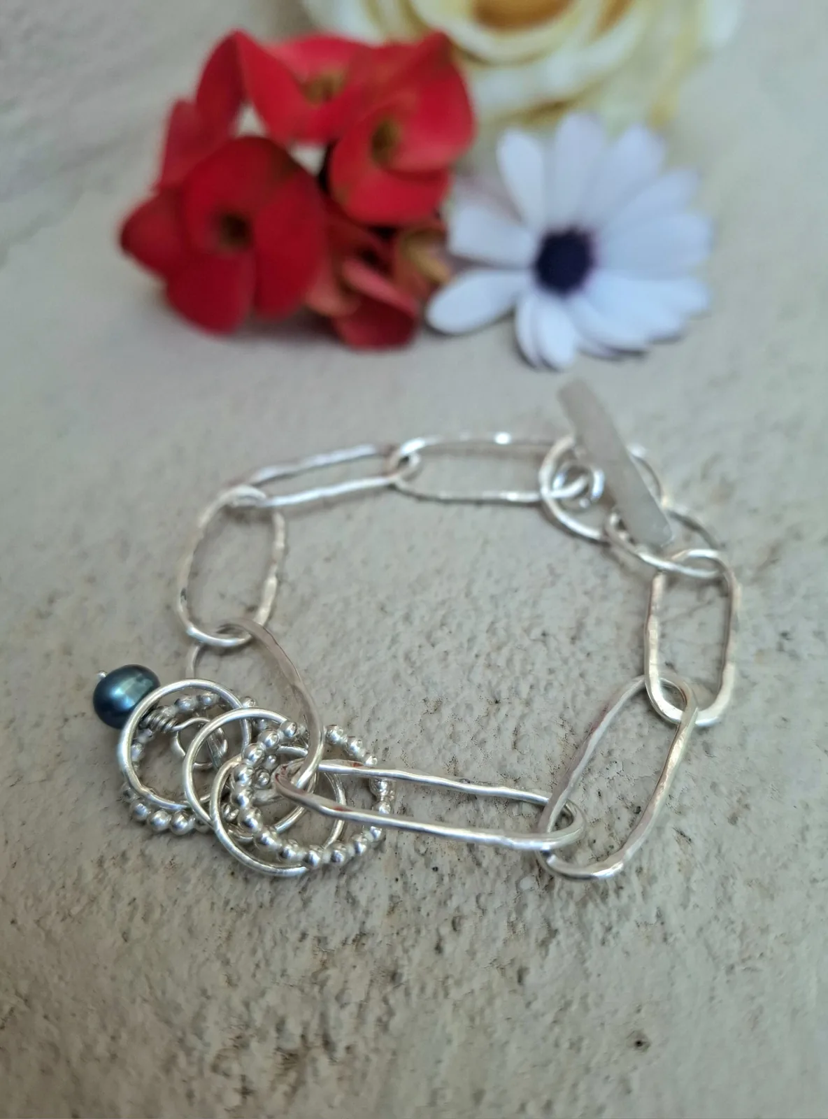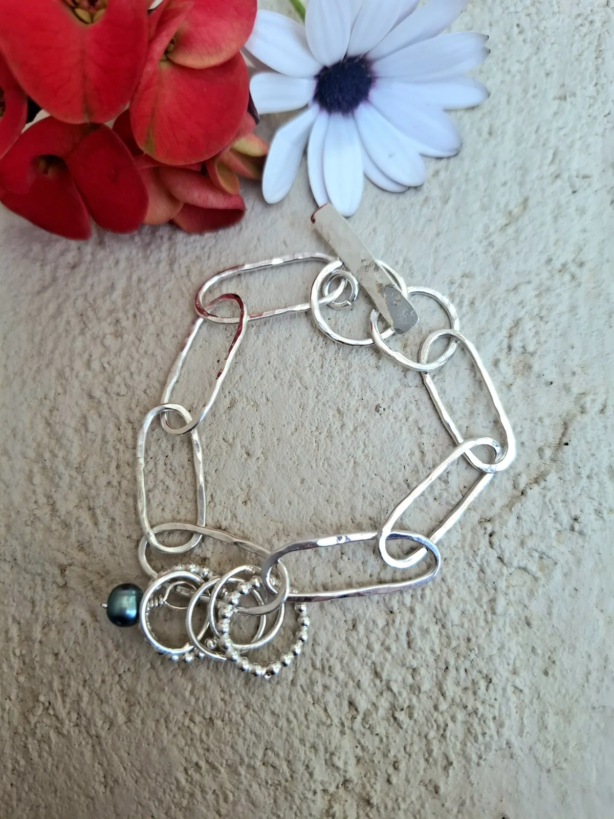 Χειροποίητο ασημένιο βραχιόλι από ασήμι 925, με ιδιαίτερη αλυσίδα και κυκλικά στοιχεία που δημιουργούν μια αρμονική, διαχρονική σύνθεση.