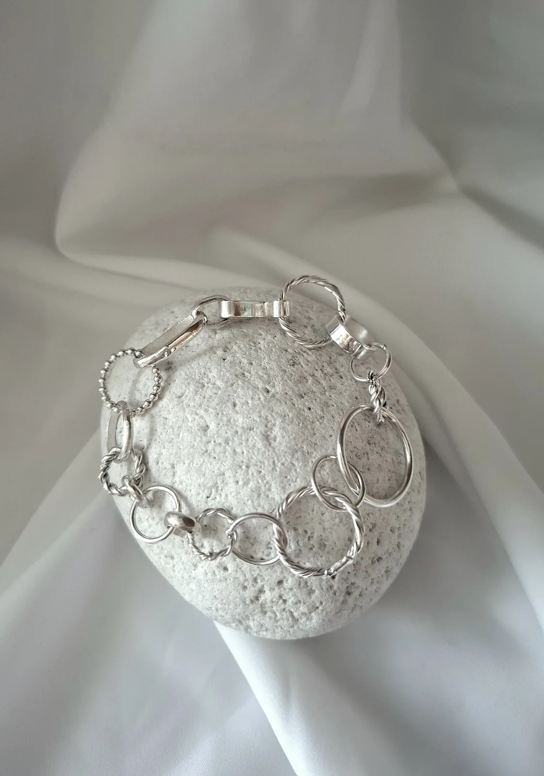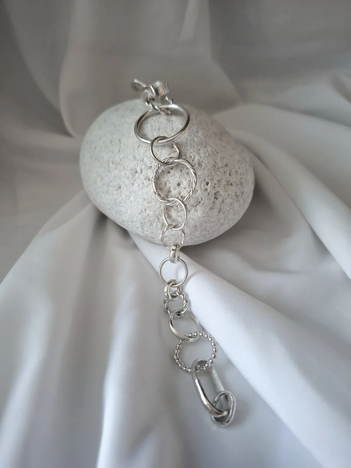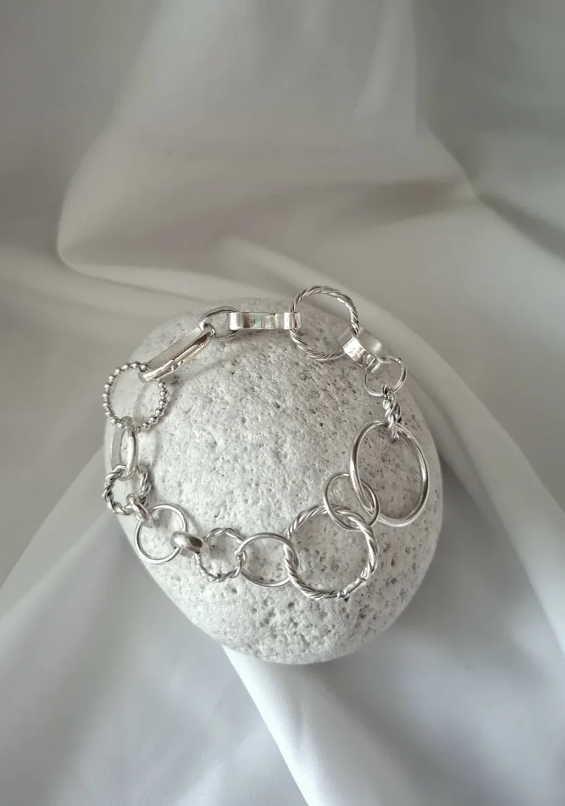 Εντυπωσιακή χειροποίητη ασημένια αλυσίδα, σχεδιασμένη με κρίκους σε διαφορετικά σχήματα και μεγέθη, που δημιουργούν ένα δυναμικό και σύγχρονο αποτέλεσμα. Η εναλλαγή των κρίκων δίνει χαρακτήρα και κίνηση στο κόσμημα, καθιστώντας το ιδανικό για όσες αγαπούν τα statement κομμάτια.