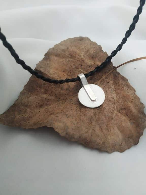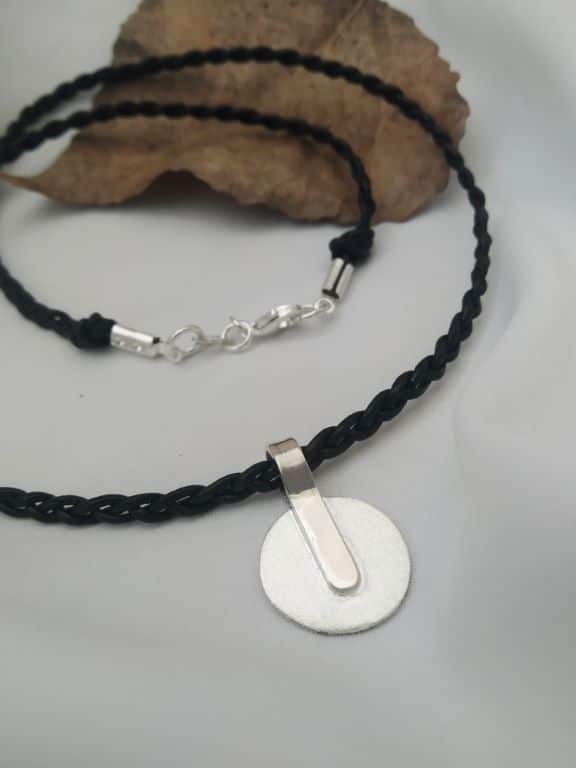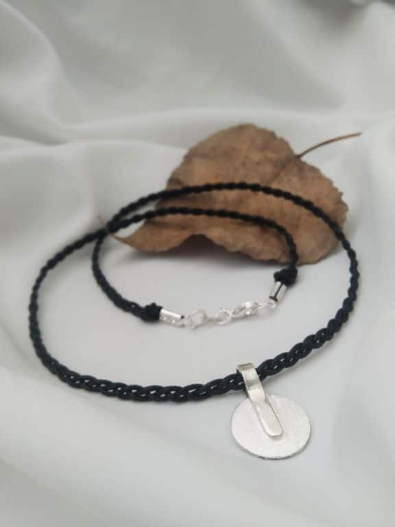 Κοντό χειροποίητο κολιέ με ασημένιο στοιχείο και πλεχτό μαύρο δερμάτινο κορδόνι.