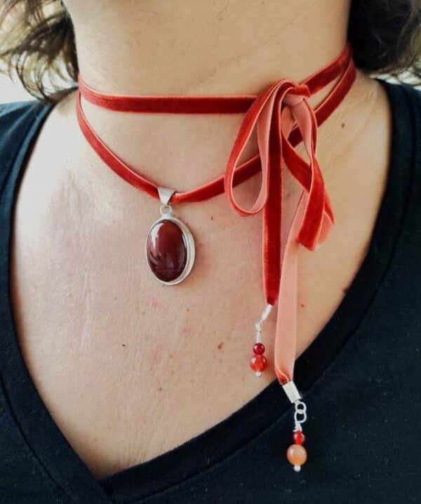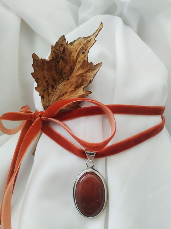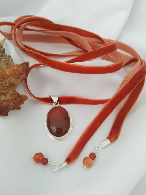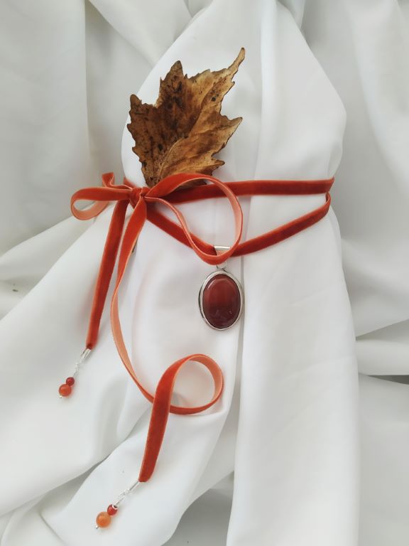 Η πέτρα αχάτη έχει μήκος 2,5 cm. Στο τελείωμα της κορδέλας πέτρες καρνεόλης.
