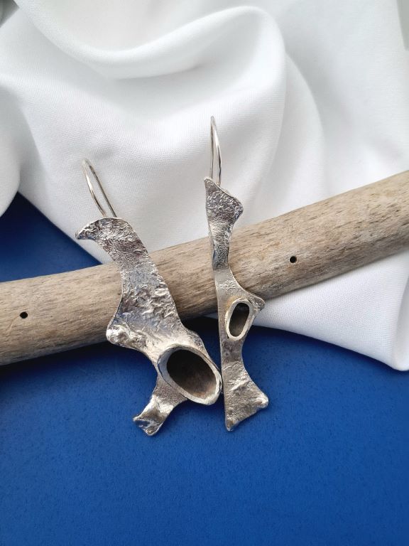 Πολύ εντυπωσιακά χειροποίητα ασύμμετρα σκουλαρίκια από ρυτιδωμένο ασήμι, με λεπτομέρεια οξείδωσης.